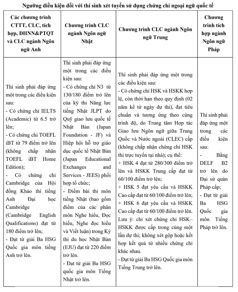 Cùng đó, thí sinh phải đạt tổng điểm thi tốt nghiệp ba môn theo tổ hợp từ 24 trở lên. Riêng nhóm xét kết hợp học bạ với chứng chỉ cần đạt tối thiểu IELTS 6.5, TOEFL iBT 79 hoặc tương đương.