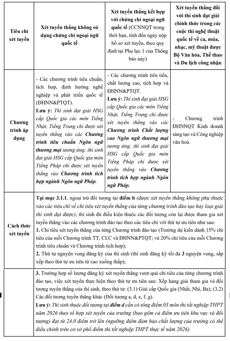 Một là xét tuyển thẳng. Ngoài nhóm theo quy định của Bộ Giáo dục và Đào tạo, trường Ngoại thương xét tuyển thẳng thí sinh đạt giải ba quốc gia trở lên hoặc dự thi Olympic quốc tế; đạt giải trong cuộc thi quốc tế về nghệ thuật, mỹ thuật (được Bộ Văn hóa, Thể thao và Du lịch công nhận).