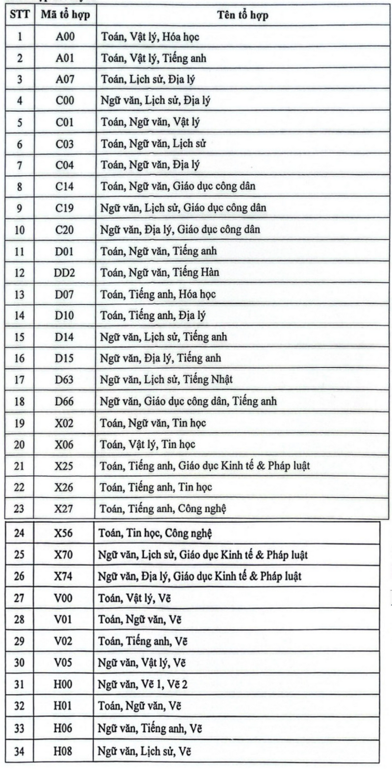 Tổ hợp: C00; C03; C04; D01; DD2; D14; D15; D63; D66; X78