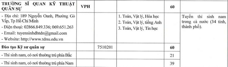 Năm 2026, Trường Sĩ quan Kỹ thuật Quân sự - Đại học Trần Đại Nghĩa thông báo tuyển sinh 60 chỉ tiêu với 4 phương thức xét tuyển, cụ thể:
