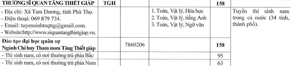 | 1 | 7860206 | Chỉ huy tham mưu Tăng Thiết giáp (Thí sinh nam miền Bắc) | A00; A01; C01 | |