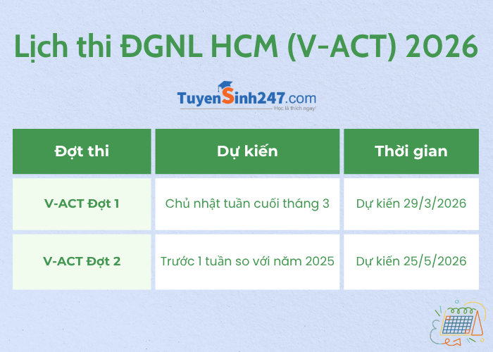 Kỳ thi đánh giá năng lực ĐH Quốc gia TPHCM (V-ACT) 2026 - được tổ chức 2 đợt thi. Tuy nhiên, lịch thi V-ACT 2026 có một số điều chỉnh so với năm trước.