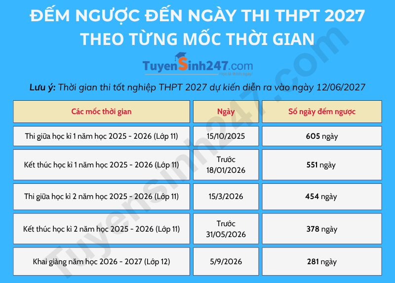 Dưới đây là chi tiết các mốc thời gian tính đến ngày thi tốt nghiệp THPT năm 2027, các em cùng tham khảo: