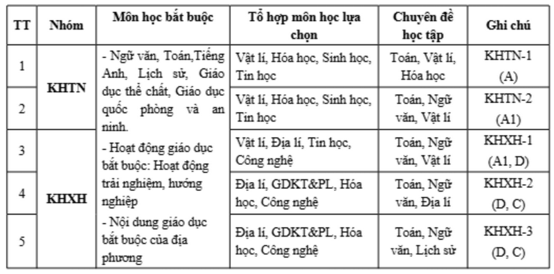 Các môn học lựa chọn: Học sinh phải chọn 4 môn trong số 9 môn học thuộc 3 nhóm: Nhóm KHTN (Vật lí, Hóa học, Sinh học); Nhóm KHXH (Địa lí, Giáo dục kinh tế và pháp luật); Nhóm CN&NT (Tin học, Công nghệ, Mỹ thuật, Âm nhạc). Nhà trường căn cứ vào tình hình thực tế, điều kiện cơ sở vật chất, giáo viên hiện có và dự kiến phân bổ chỉ tiêu tuyển sinh lớp 10 năm học 2025-2026 theo nhóm môn KHTN, KHXH cụ thể như sau:
