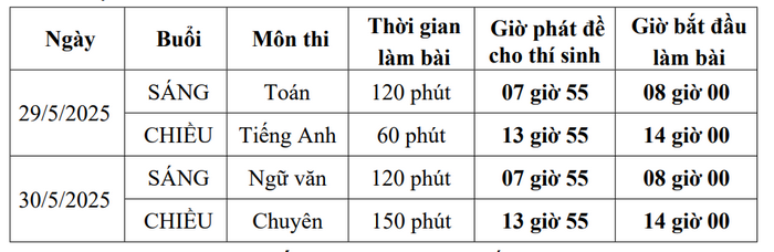 Ngoài đối tượng tuyển thẳng tất cả học sinh thi tuyển vào lớp 10 phải dự thi bằng hình thức thi viết 3 môn: Toán (tự luận), Ngữ văn (tự luận) và Tiếng Anh (trắc nghiệm và tự luận). Thời gian làm bài thi: môn Toán: 120 phút, môn Ngữ văn: 120 phút, môn Tiếng Anh: 60 phút.