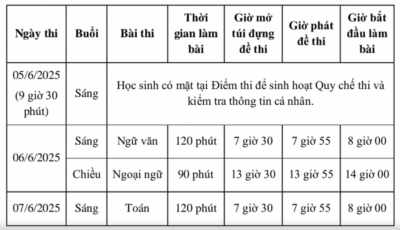- Thời gian làm bài thi: Các bài thi môn Toán và môn Ngữ văn: 120 phút/môn; môn Ngoại ngữ là 90 phút.