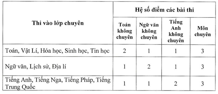 c) Hệ số điểm bài thi Hệ số điểm bài thi được quy định riêng cho từng lớp chuyên, cụ thể: